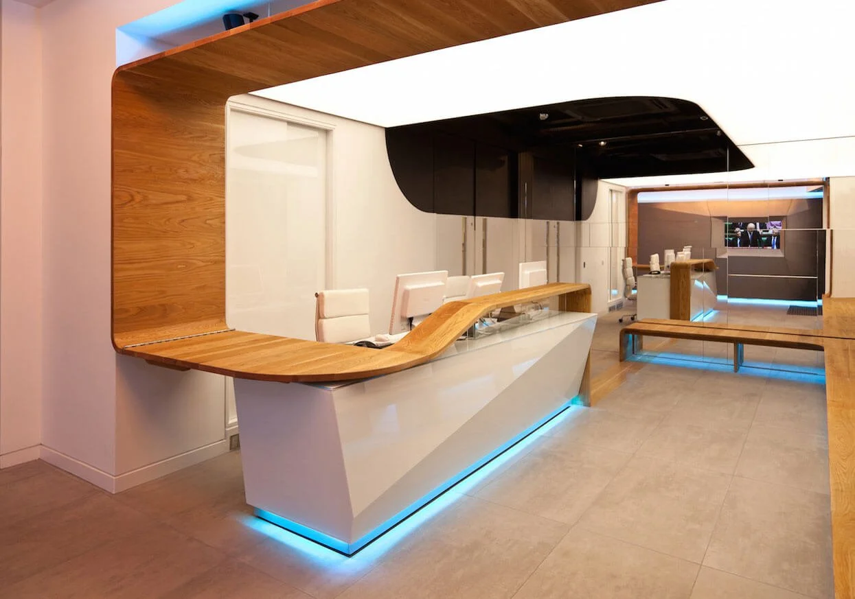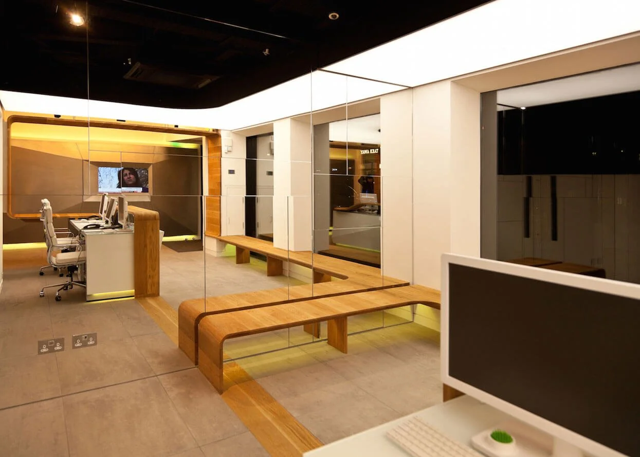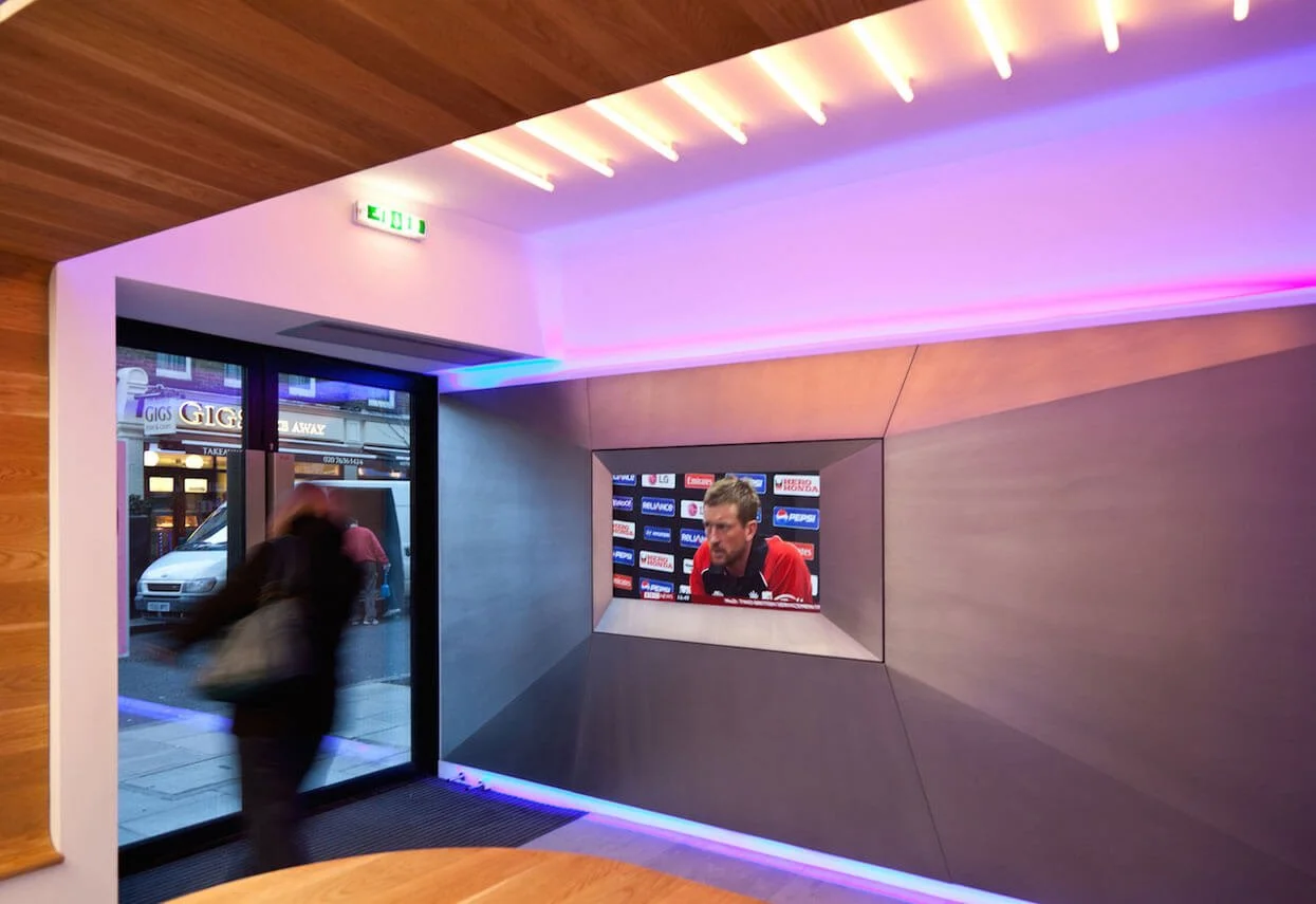 A continuous seam of wooden strips outlined the ceiling and featured along the floor; the theme of wood was extended into the reception and seating area.Fully interchangeable coloured LED lighting integrated into the scheme turned the interim space into a valuable space used for client pitches and reception events. Being a media company it was inevitable a colossal TV would have a presence and so it was only fitting that we customized its frame in a liquid metal.